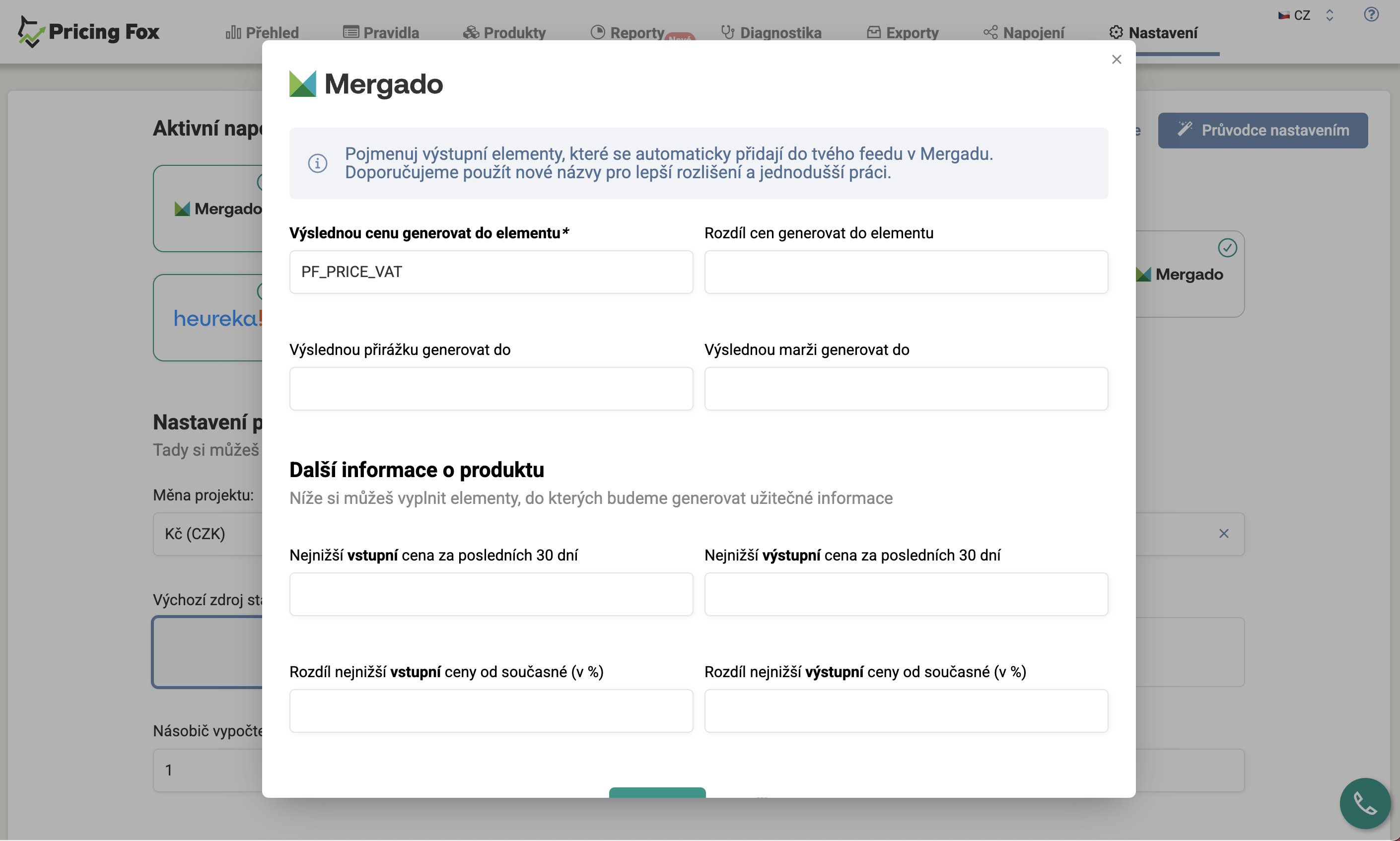 Pricing Fox je rozšíření běžící na platformě Mergado – Mergado zajišťuje manipulaci s feedem, plánování exportů a distribuci cen.