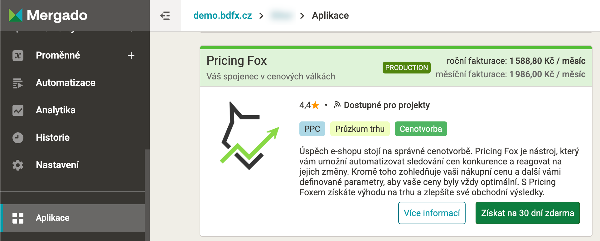 Stačí se zaregistrovat s vaší e-mailovou adresou a zvolit si vhodné heslo. Platební údaje můžete zadat až ve chvíli, kdy si budete jisti, že chcete Mergado a Pricing Fox používat i po zkušební 30denní lhůtě, ve které máte plnou funkčnost obou systémů zdarma a bez omezení.