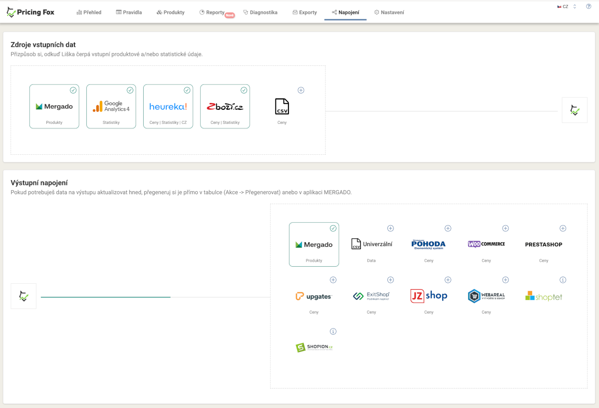 Info# Na stránce Napojení nastavíte všechna důležitá spojení, a to jak směrem do Pricing Foxu, tak i směrem ven. Rozcestník# Vstup Zdroje vstupních dat – Heureka, Zboží.cz, GA4 a CSV import. Výstup Výstupní konektory – Upgates, Pohoda, Woocommerce a další.