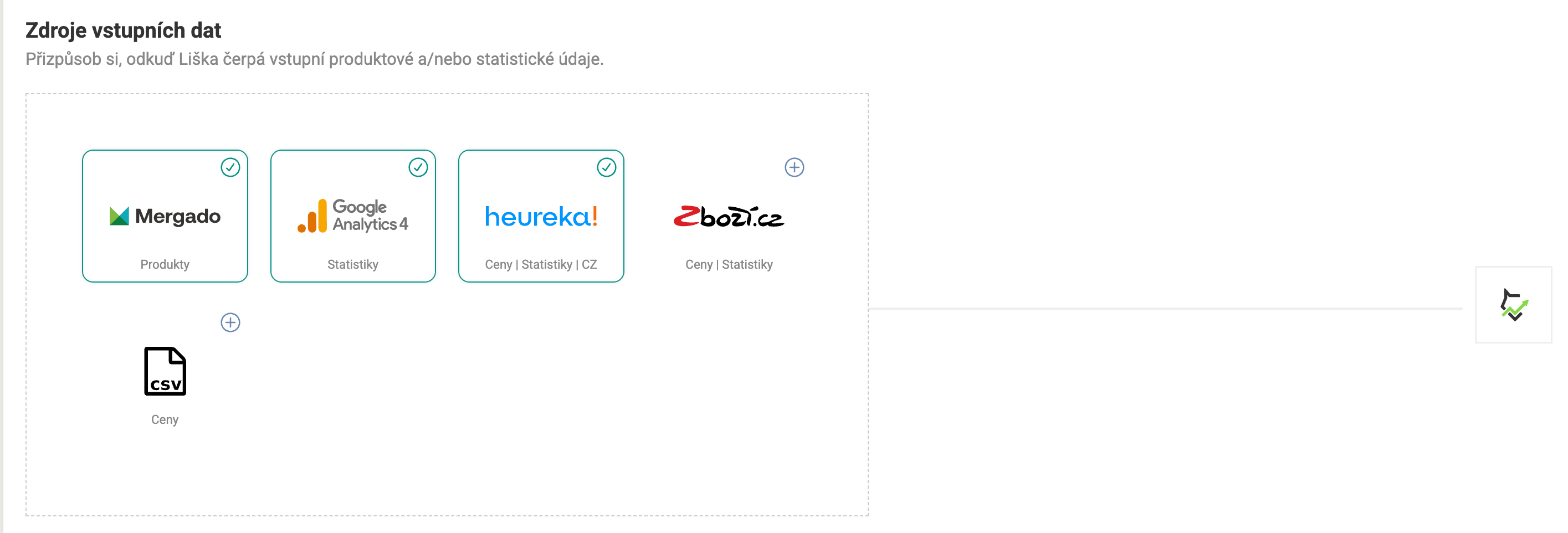 Pro vstupní data můžete v Pricing Foxu využít hned několik zdrojů. Základní data o vašich produktech čerpáme z Mergada, proto je toto napojení vždy aktivní. Informace o konkurenčních e-shopech, cenách, či jak si vaše produkty na srovnávačích vedou se dozvíte, pokud si napojíte Heureku a/nebo Zboží.cz. Výkonnostní data z GA4 pak přidáte vytvořením spojení v Mergado Keychain ze kterého dokáže Pricing Fox informace automaticky stahovat. Vlastní CSV import můžete využít pokud máte vlastní zdroj referenčních cen, které chcete využít při přeceňování produktů.