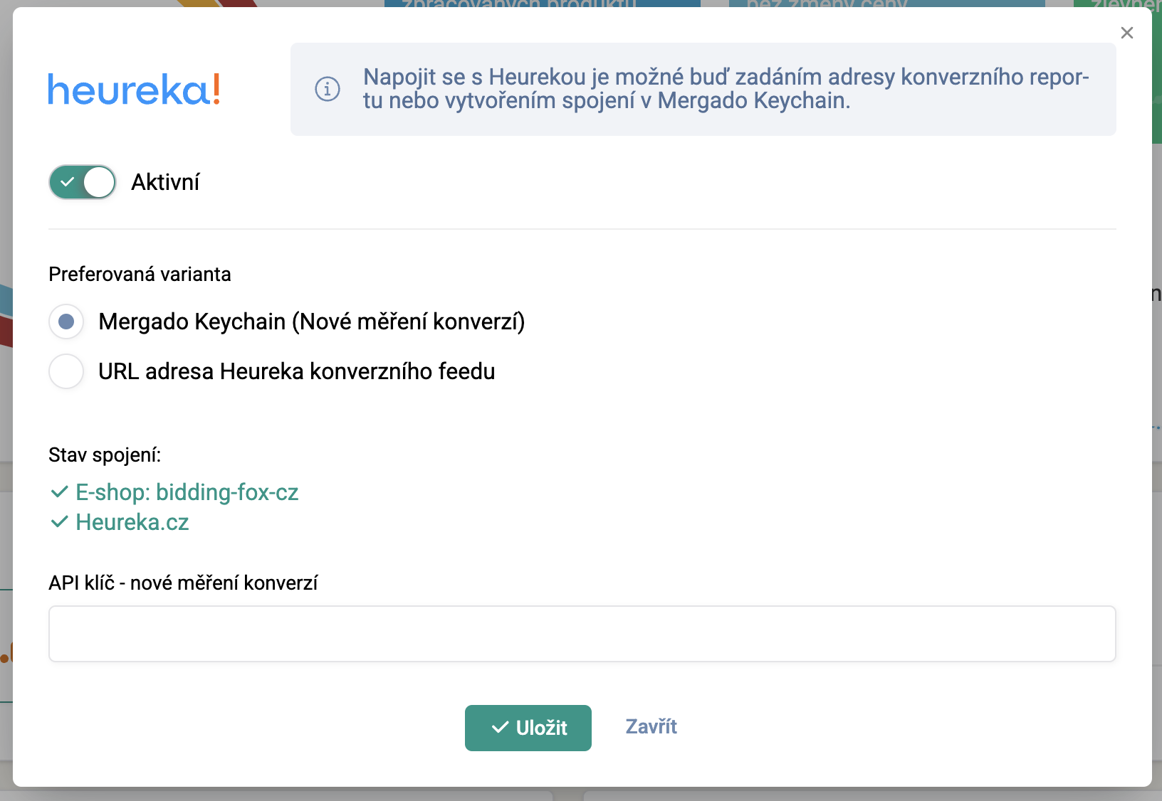 V aplikaci Mergado Keychain si zvolte napojení na Heureka.cz nebo Heureka.sk (bohužel nelze aktivovat obě varianty současně).