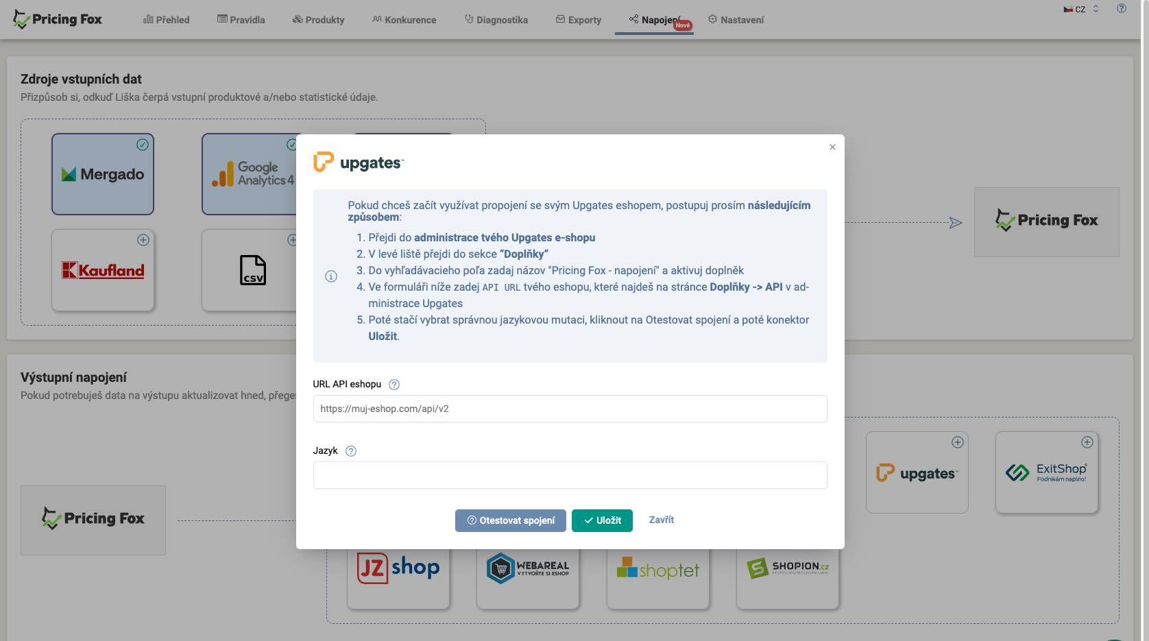 - Aktivujte doplněk v administraci Upgates. Poté v aplikaci Pricing Fox v sekci “Napojení” přidejte údaje pro spojení s Upgates. Spojení můžete otestovat přímo v aplikaci.