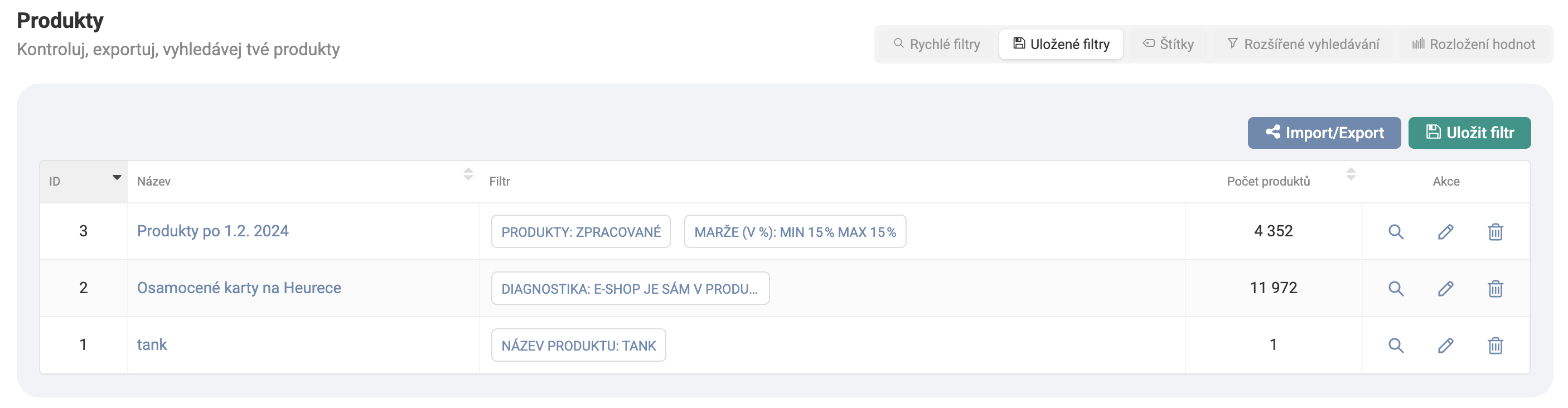 Rychlé filtry, uložené filtry a rozšířené vyhledávání.