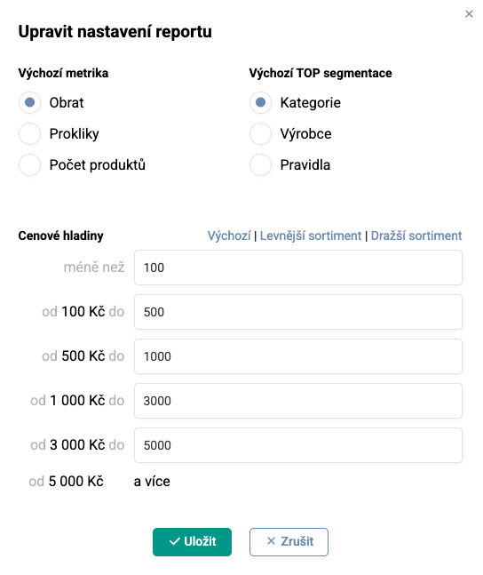 | Cenové hladiny | Je možné zvolit předdefinované výchozí hodnoty, námi předvolené rozdělení pro dražší (resp. levnější sortiment) anebo zvolit vlastní rozdělení cen. | CZK: 100, 500, 1000, 3000, 5000 EUR: 5, 20, 40, 120, 200 |