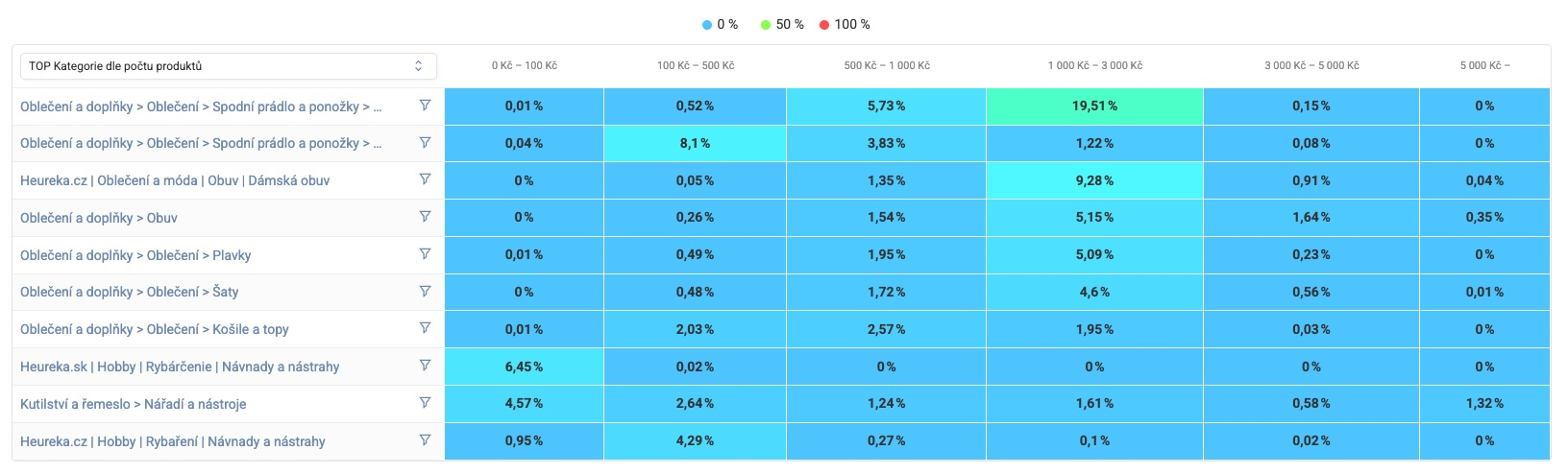Dlouhé řady stejné barvy: Pokud je příliš mnoho buněk zabarveno do modro/zelených odstínů – podíl produktů je rozložen napříč více cenovými hladinami a žádná z cenových hladin nedominuje. Existuje tak široký cenový rozptyl mezi produkty, což znamená, že sortiment obsahuje jak prémiové, tak levné varianty. Díky tomu je možnost pracovat s diferenciací při marketingu, biddingu i analýze pricingu: