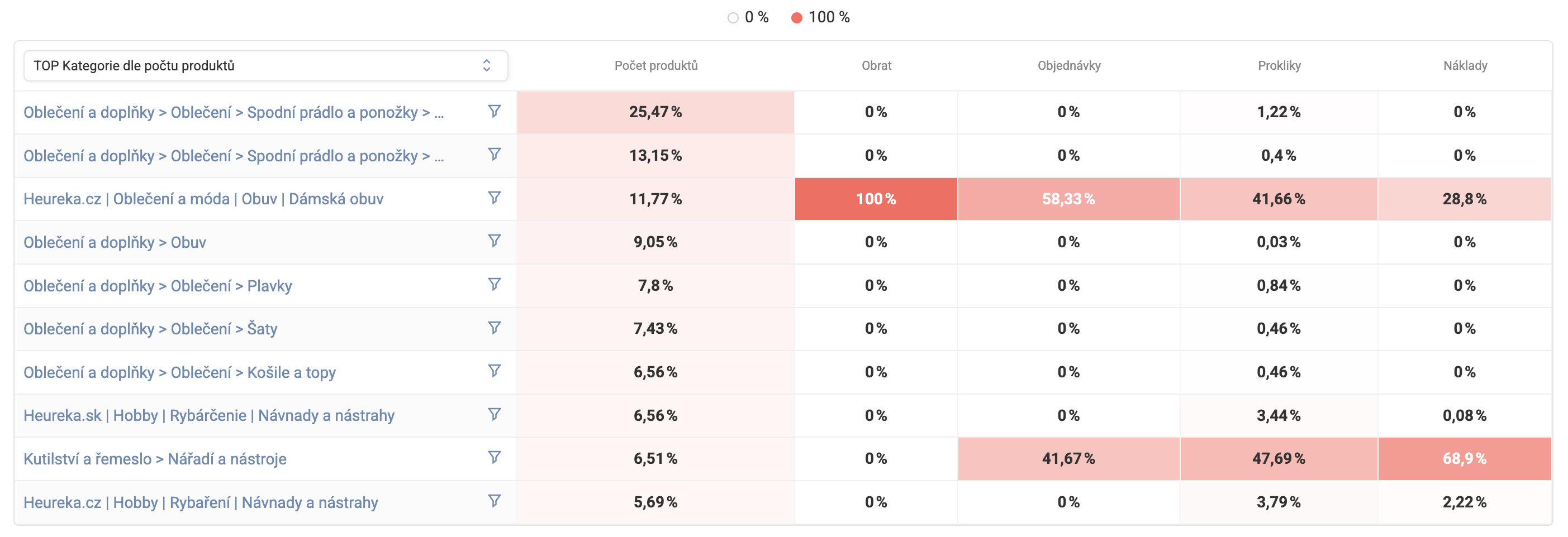 TOP kateogorie podle počtu produktů/obratu/prokliků