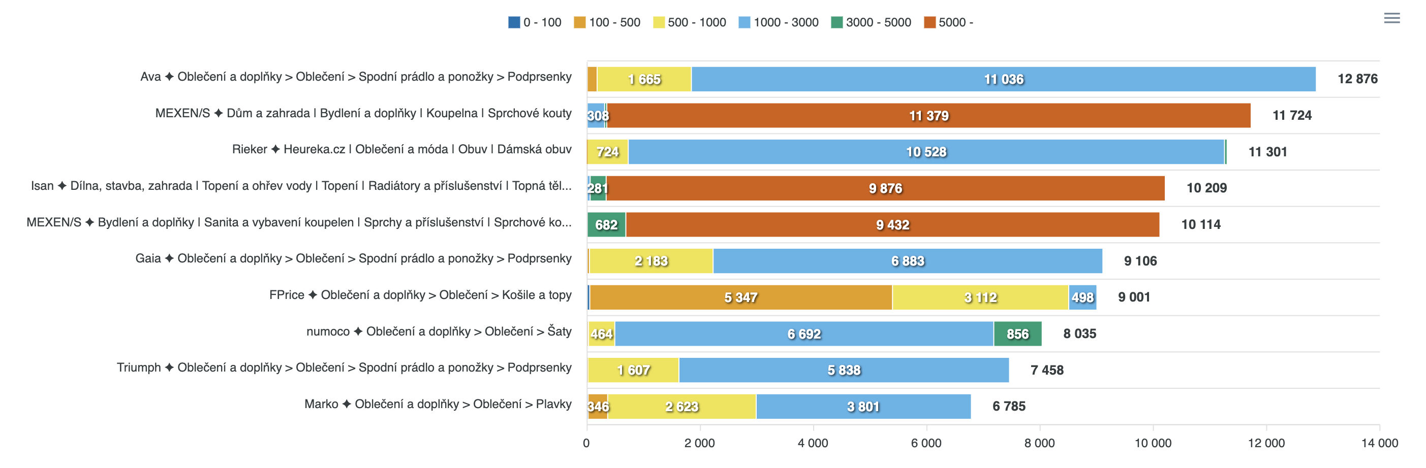Vodorovné pruhy reprezentují TOP 10 kombinace Výrobce ✦ Kategorie dle zvolené metriky v ⚙️ Předvolbách. Segmenty pruhu jsou rozřezané podle cenových hladin (viz barevná legenda nad grafem).*