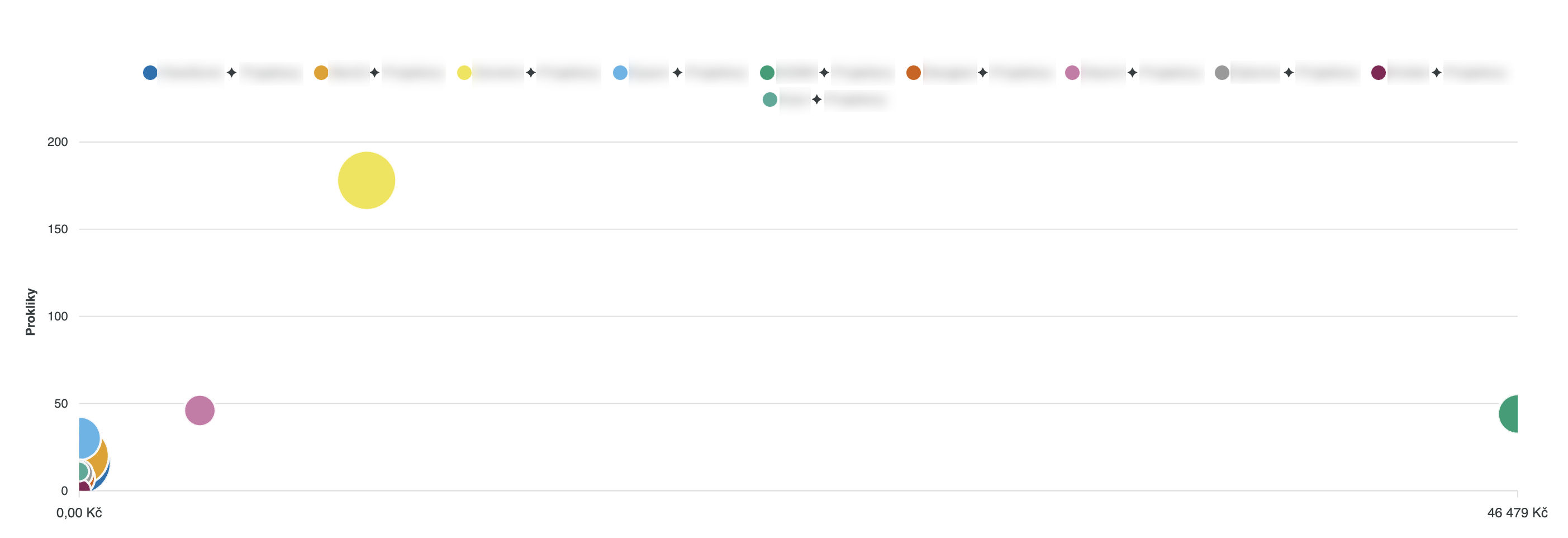 Pokud jsou k dispozici údaje z měření statistik*, Pricing Fox zobrazí jednotlivé TOP segmenty (Výrobce ✦ Kategorie) jako bubliny, kde: