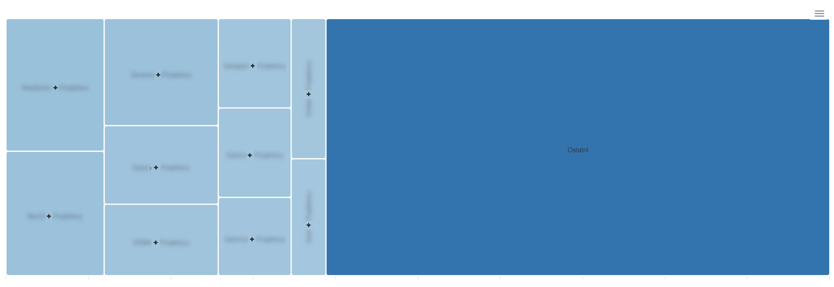Obdélník “Ostatní”: Pokud tento odbdélník zabírá většinu plochy grafu, znamená to, že většina obratu (při nastavení metriky „Obrat“ v možnosti „Předvolby“) nepochází ze zobrazených TOP 10. Toto signalizuje, že máte výkon rozložený do vyššího počtu segmentů a ve vašem sortimentu tedy neexistují jednoznačné hvězdy