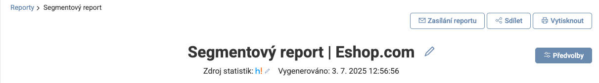 | Zdroj statistik | Logo indikuje zdroj dat využívaný pro výkonnostní data reportu. Klepnutím na „pero“ vedle loga můžete tento zdroj změnit.\ Pozn.: Změna zdroje se vztahuje pouze na segmentový report a bude použita při každém dalším jeho vygenerování |